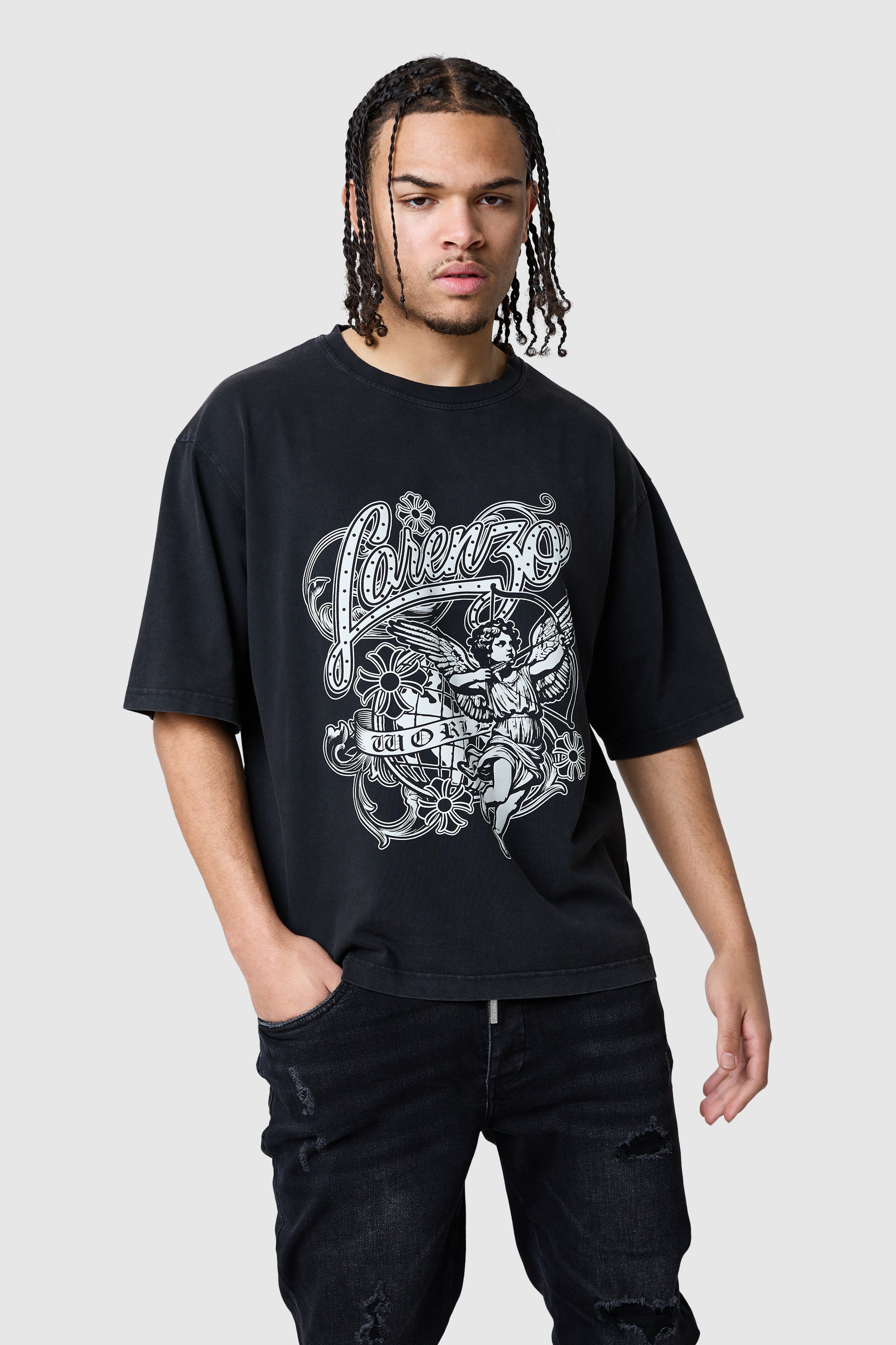 An everyday tee elevated with statement graphics. The Cherub Tee in Black Acid Wash is crafted from soft cotton for a comfortable feel, featuring a classic silhouette finished with a bold graphic print on the front. Designed for easy styling, it’s a go-to piece for effortless streetwear looks.
