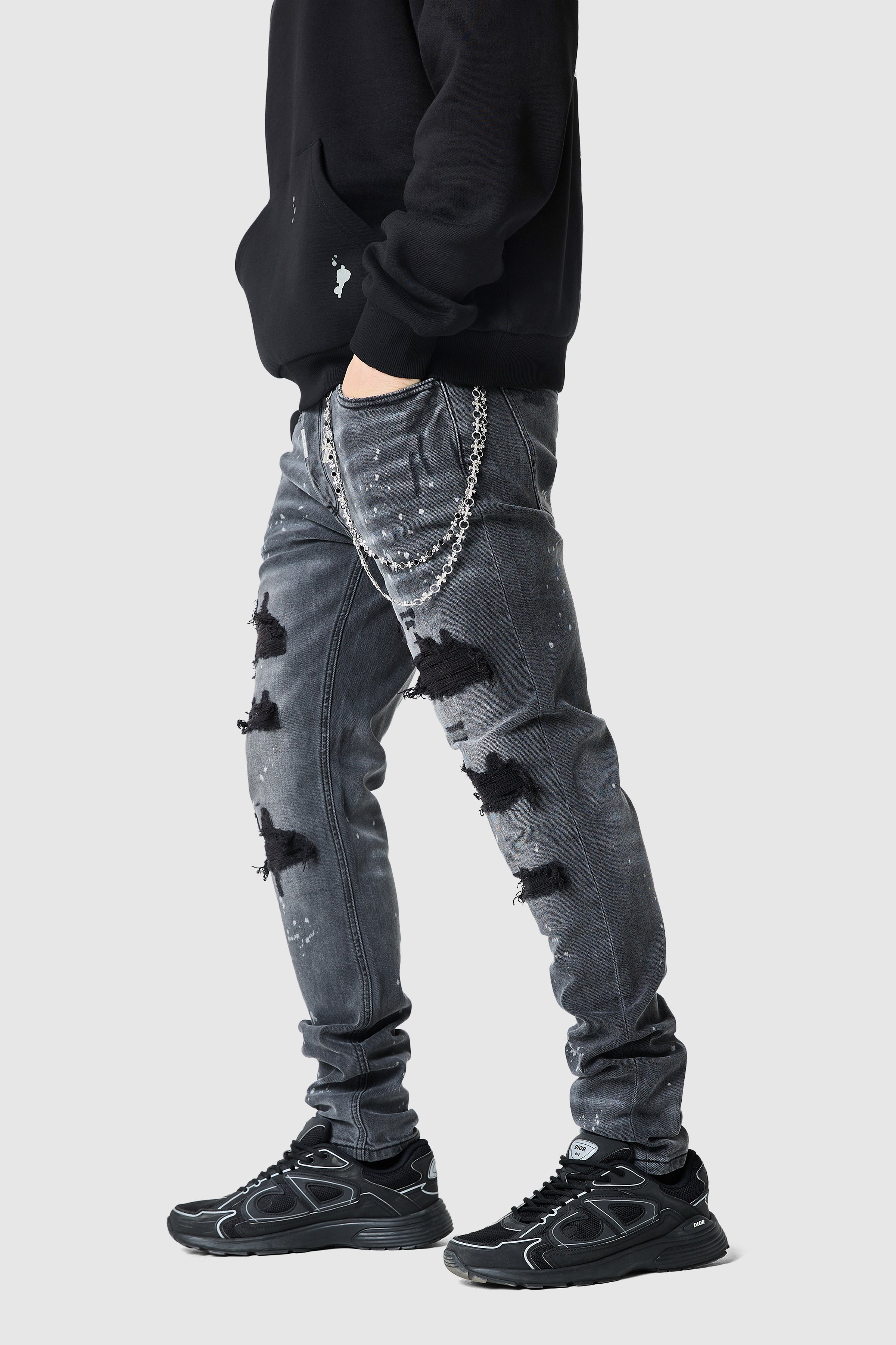 The Dillon Diamante Jean offers a slim fit with a slightly looser waist and thigh, delivering a close, comfortable silhouette with diamante detail. Finished with backed distressing and subtle paint splash detailing for a modern edge.