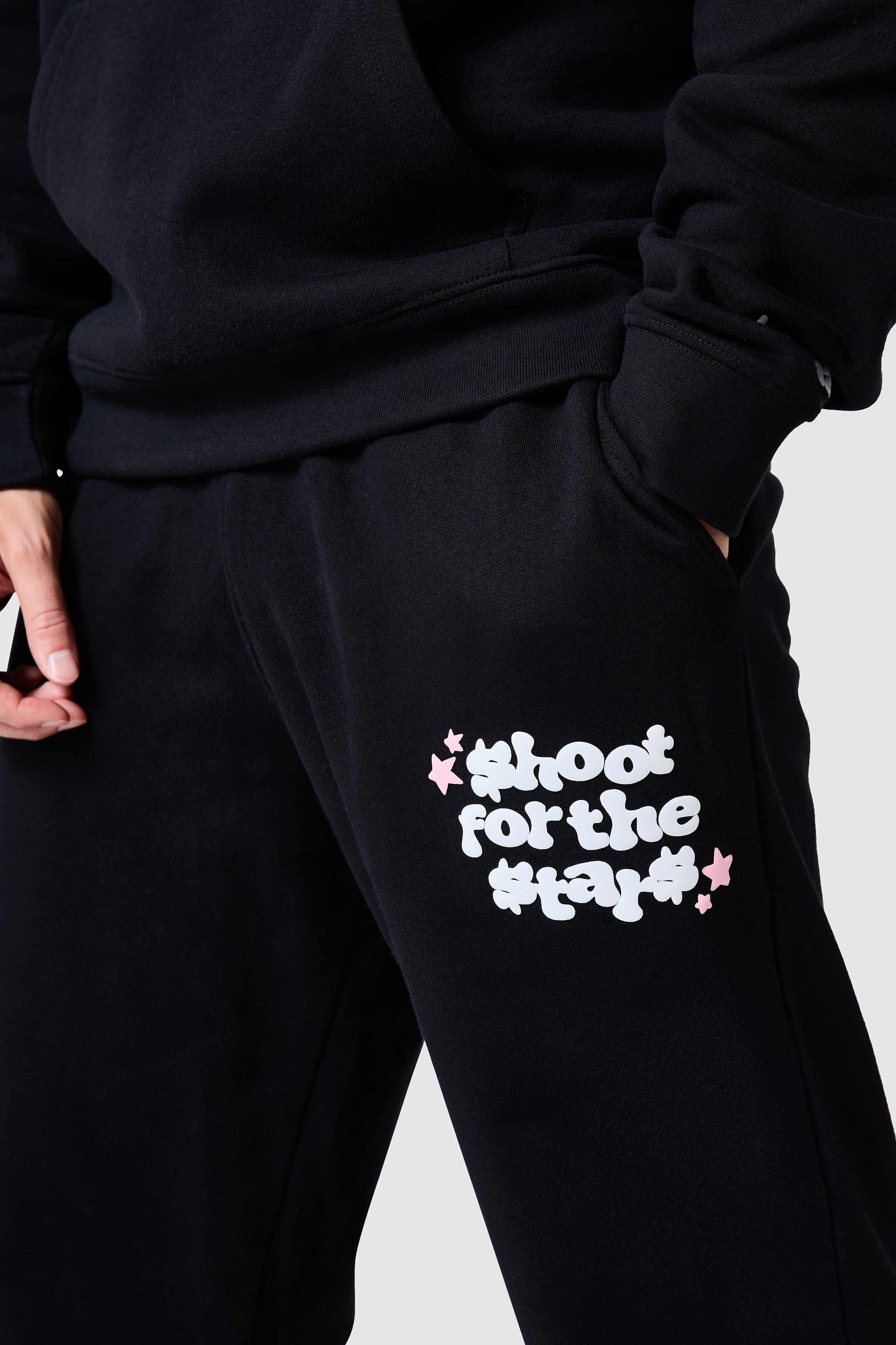 Le jogging Shoot For The Stars présente une coupe ample et évasée avec un imprimé graphique audacieux, alliant confort et style sans effort. Associez-le à la capuche assortie pour un look décontracté et complet.