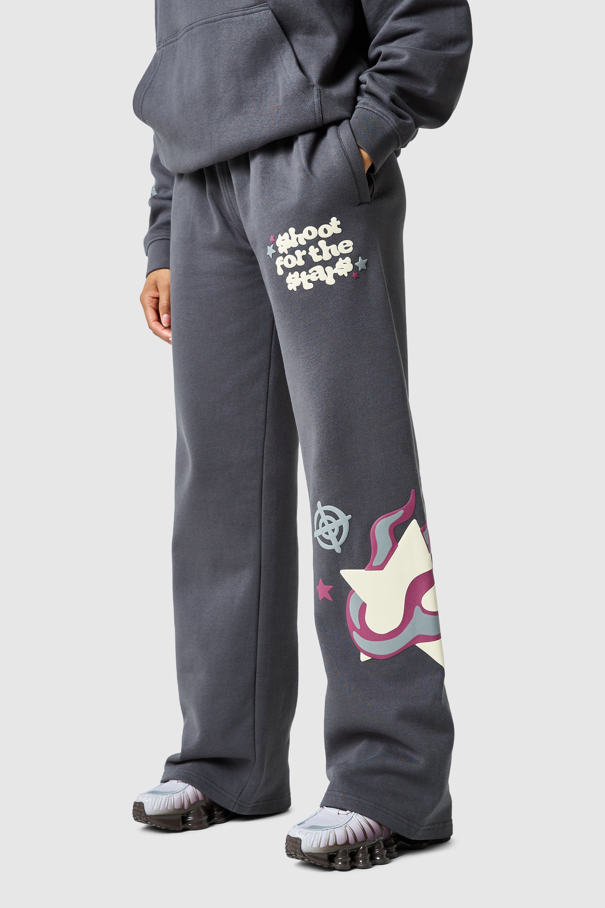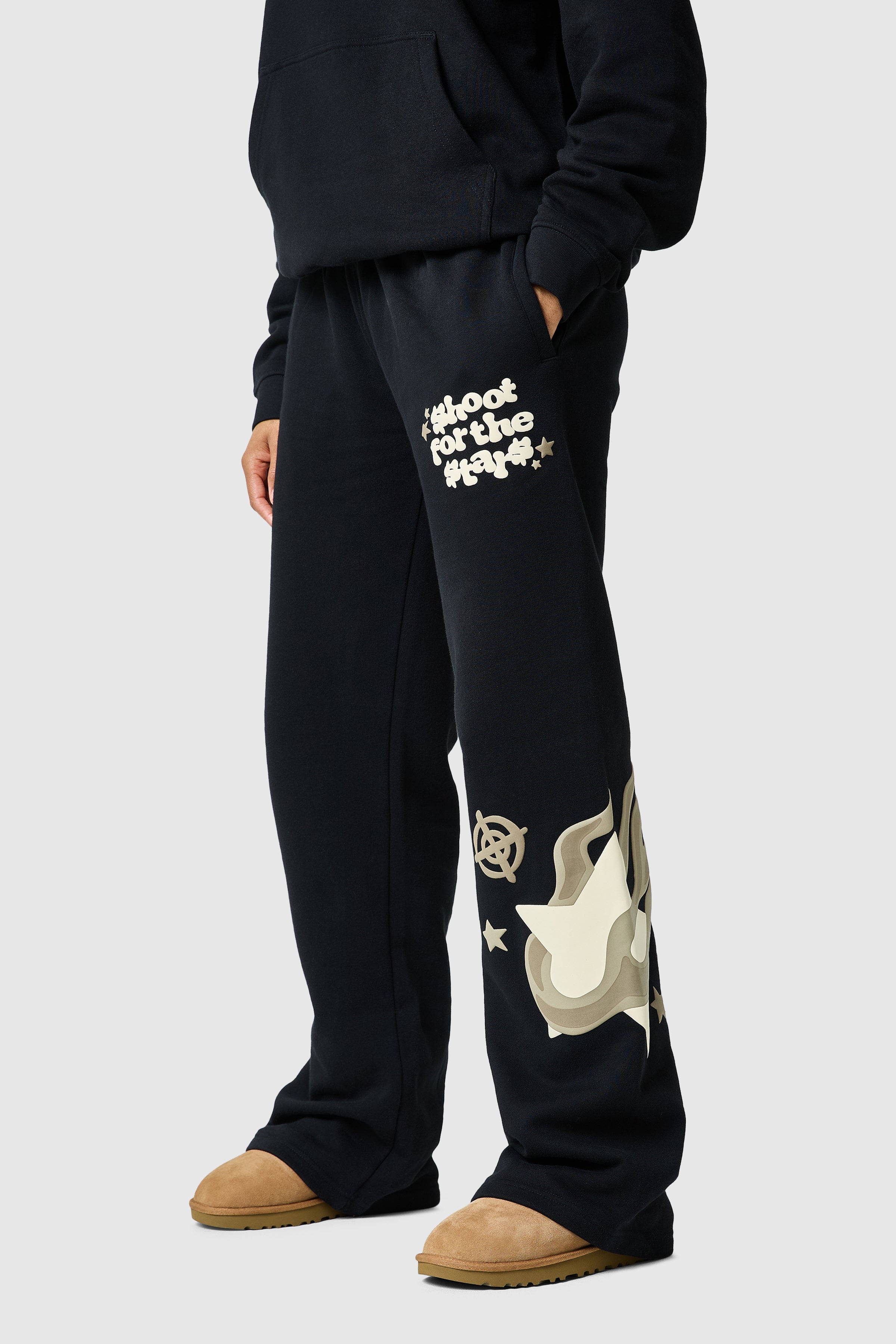 Le jogging Shoot For The Stars présente une coupe ample et évasée avec un imprimé graphique audacieux, alliant confort et style sans effort. Associez-le à la capuche assortie pour un look décontracté et complet.